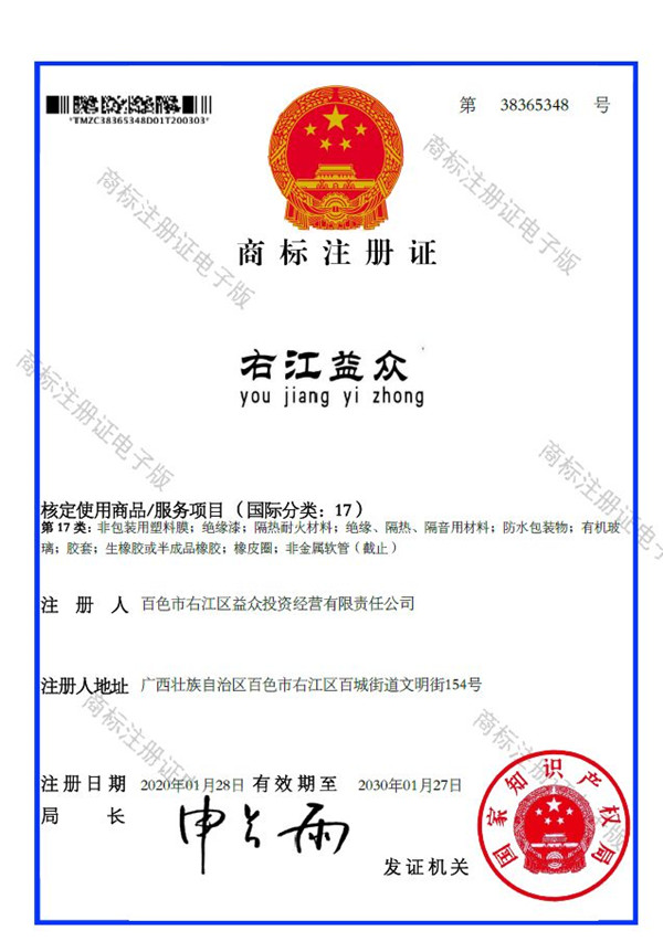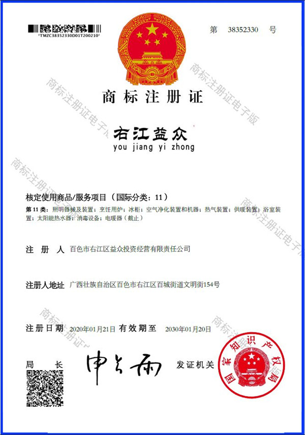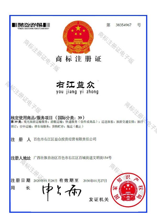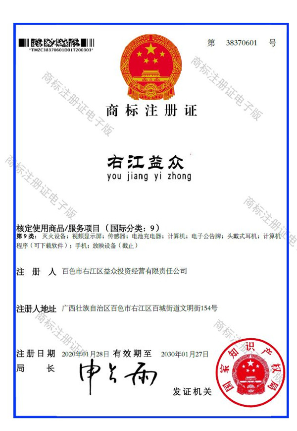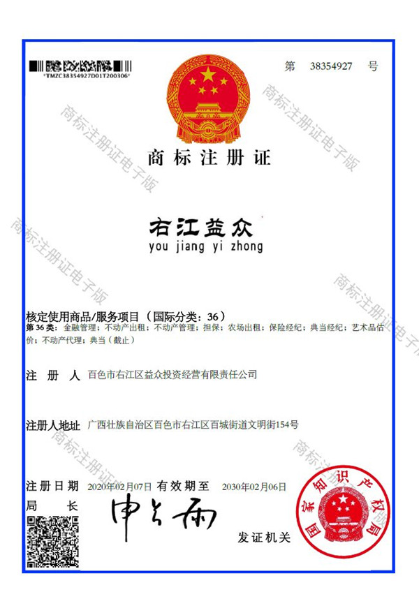2019年4月,為樹立企業(yè)品牌形象,充分展現(xiàn)品牌價(jià)值,廣西百色益眾投資有限公司按照建設(shè)現(xiàn)代企業(yè)的方向和標(biāo)準(zhǔn),啟動(dòng)品牌商標(biāo)注冊申報(bào)工作,經(jīng)過6個(gè)月的審核期和3個(gè)月的公告期,“右江益眾”45個(gè)大類商標(biāo)品牌第一時(shí)間成功獲批?!坝医姹姟逼放频某晒ψ?,有利于公司更好地參與市場競爭,同時(shí),對(duì)于強(qiáng)化企業(yè)內(nèi)部管理、樹立良好的企業(yè)形象、提升公司美譽(yù)度也可起到積極的助推作用。