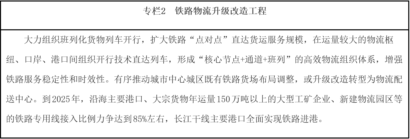 推進結(jié)構(gòu)性降成本。加快推進鐵路專用線進港區(qū)、連園區(qū)、接廠區(qū),合理有序推進大宗商品等中長距離運輸“公轉(zhuǎn)鐵”、“公轉(zhuǎn)水”。完善集裝箱公鐵聯(lián)運銜接設(shè)施,鼓勵發(fā)展集拼集運、模塊化運輸、“散改集”等組織模式,發(fā)揮鐵路干線運輸成本低和公路網(wǎng)絡(luò)靈活優(yōu)勢,培育有競爭力的“門到門”公鐵聯(lián)運服務(wù)模式,降低公鐵聯(lián)運全程物流成本。統(tǒng)籌沿海港口綜合利用,提升大型港口基礎(chǔ)設(shè)施服務(wù)能力,提高碼頭現(xiàn)代化專業(yè)化規(guī)?;剑涌焱七M鐵水聯(lián)運銜接場站改造,提高港口鐵路專用線集疏網(wǎng)絡(luò)效能,優(yōu)化作業(yè)流程。完善內(nèi)河水運網(wǎng)絡(luò),統(tǒng)籌江海直達、江海聯(lián)運發(fā)展,發(fā)揮近海航線、長江水道、珠江水道等水運效能,穩(wěn)步推進貨物運輸“公轉(zhuǎn)水”。推進鐵水聯(lián)運業(yè)務(wù)單證電子化,促進鐵路、港口信息互聯(lián),實現(xiàn)鐵路現(xiàn)車、裝卸車、貨物在途、到達預(yù)確報以及港口裝卸、貨物堆存、船舶進出港、船期艙位預(yù)定等鐵水聯(lián)運信息交換共享。支持港口、鐵路場站加快完善集疏運油氣管網(wǎng),有效對接石化等產(chǎn)業(yè)布局,提高管道運輸比例。