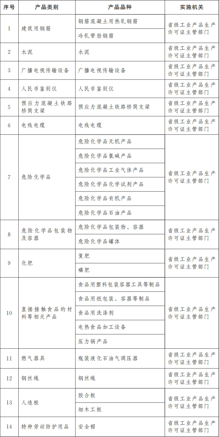 為保障重要工業(yè)產(chǎn)品質(zhì)量安全,強(qiáng)化產(chǎn)品準(zhǔn)入管理和源頭治理,防范產(chǎn)品質(zhì)量安全重大風(fēng)險(xiǎn),確保人民群眾生命財(cái)產(chǎn)安全和公共安全,國(guó)務(wù)院決定,調(diào)整完善工業(yè)產(chǎn)品生產(chǎn)許可證管理目錄,對(duì)冷軋帶肋鋼筋、瓶裝液化石油氣調(diào)壓器、鋼絲繩、膠合板、細(xì)木工板、安全帽等6種產(chǎn)品實(shí)施工業(yè)產(chǎn)品生產(chǎn)許可證管理。調(diào)整后,實(shí)施工業(yè)產(chǎn)品生產(chǎn)許可證管理的產(chǎn)品共計(jì)14類27個(gè)品種,由省級(jí)工業(yè)產(chǎn)品生產(chǎn)許可證主管部門(mén)負(fù)責(zé)實(shí)施,相關(guān)審批權(quán)限不得下放。同時(shí),化肥生產(chǎn)許可證審批方式由告知承諾調(diào)整為“先核后證”審批。