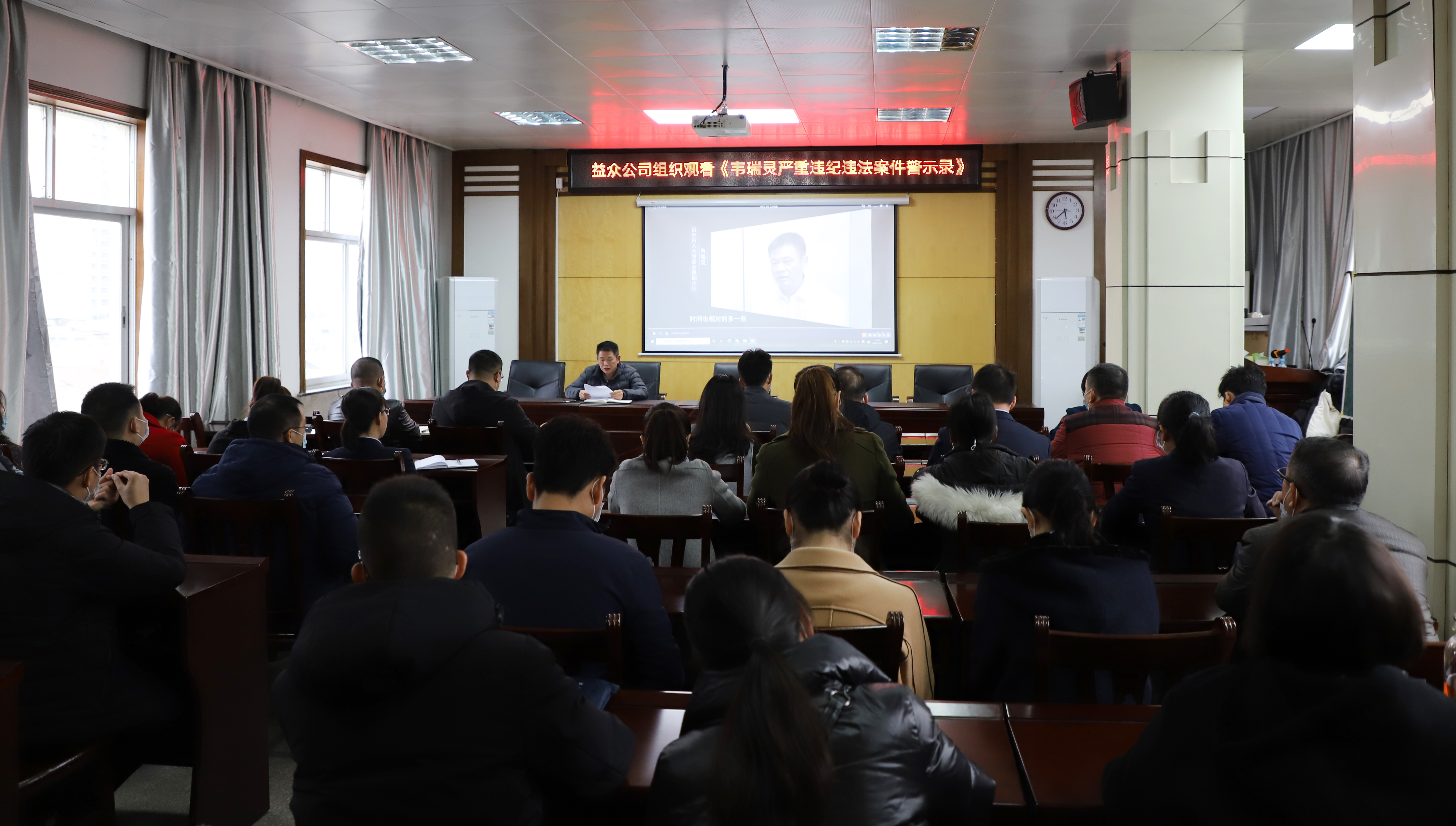 ????????根據(jù)右江區(qū)委要求,結(jié)合“不忘初心、牢記使命”主題教育。1月29日,益眾公司領(lǐng)導(dǎo)班子成員、全體黨員干部及各部門(mén)(子公司)中層干部集中觀看了《理想信念滑坡是最危險(xiǎn)的滑坡——廣西百色市人大常委會(huì)原副主任韋瑞靈嚴(yán)重違紀(jì)違法案件警示錄》專(zhuān)題片。