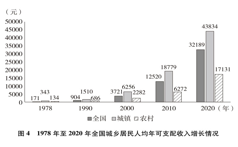人民生活水平顯著提高。居民收入持續(xù)增加,全國居民人均年可支配收入從1978年的171元增加到2020年的32189元(圖4)。城鄉(xiāng)居民恩格爾系數(shù)分別從1978年的57.5%、67.7%下降到2020年的29.2%、32.7%(圖5),城鄉(xiāng)居民生活質(zhì)量不斷提升。溫飽問題解決后,人們對生活品質(zhì)、品位有了更高的追求,衣食住行不斷升級,消費結(jié)構(gòu)從生存型逐漸向發(fā)展型、享受型過渡。衣,從穿暖到穿美、穿出時尚;食,從吃飽到吃好、吃出健康;住,從有所居到更敞亮、更宜居;行,從便利通暢到快捷舒適。吃穿用有余,家電全面普及,乘用汽車快速進(jìn)入尋常百姓家。餐飲、健康、教育、旅游、文娛等服務(wù)性消費持續(xù)快速增長,在居民人均消費支出中占比逐漸達(dá)到一半左右。越來越多的人有“錢”有“閑”,“詩和遠(yuǎn)方”更加觸手可及,“說走就走”不再是夢想,旅游扮靚人們的幸福生活,中國正在進(jìn)入大眾旅游時代。