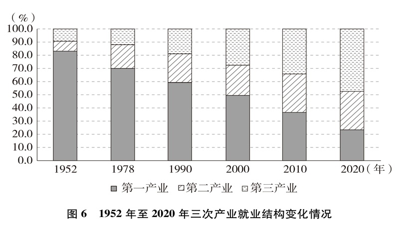 產(chǎn)業(yè)結(jié)構(gòu)優(yōu)化升級。中國已建成世界上最完整的產(chǎn)業(yè)體系,產(chǎn)業(yè)發(fā)展持續(xù)向中高端邁進(jìn)。三次產(chǎn)業(yè)增加值之比從1952年的50.5∶20.8∶28.7到2020年的7.7∶37.8∶54.5,中國從傳統(tǒng)農(nóng)業(yè)大國成為工業(yè)大國、服務(wù)業(yè)大國(圖3),中國經(jīng)濟從依賴單一產(chǎn)業(yè)為主轉(zhuǎn)向依靠三次產(chǎn)業(yè)共同帶動。農(nóng)業(yè)現(xiàn)代化成效顯著,機械化、數(shù)字化、綠色化、功能化、共享化水平明顯提高,廣大農(nóng)民逐步告別“面朝黃土背朝天、一身力氣百身汗”的辛勞,農(nóng)村生產(chǎn)力極大解放;糧食生產(chǎn)能力穩(wěn)步提升,實現(xiàn)谷物基本自給,中國人把飯碗牢牢端在自己手中。中國建成門類齊全、獨立完整的現(xiàn)代工業(yè)體系,工業(yè)化和信息化融合發(fā)展的廣度和深度不斷拓展,“中國制造”向“中國智造”轉(zhuǎn)型升級,產(chǎn)業(yè)鏈供應(yīng)鏈現(xiàn)代化水平進(jìn)一步提升。以新一代信息技術(shù)、生物技術(shù)、高端裝備、綠色環(huán)保為代表的戰(zhàn)略性新興產(chǎn)業(yè)發(fā)展迅速,成為引領(lǐng)高質(zhì)量發(fā)展的重要引擎。數(shù)字經(jīng)濟激發(fā)經(jīng)濟發(fā)展新活力,產(chǎn)業(yè)數(shù)字化和數(shù)字產(chǎn)業(yè)化趨勢加快?,F(xiàn)代服務(wù)業(yè)加速發(fā)展,以“互聯(lián)網(wǎng)+”為標(biāo)志的新業(yè)態(tài)、新模式層出不窮,平臺經(jīng)濟、共享經(jīng)濟蓬勃興起,生產(chǎn)性服務(wù)業(yè)向?qū)I(yè)化和高端化發(fā)展,生活性服務(wù)業(yè)向精細(xì)化和高品質(zhì)轉(zhuǎn)變。產(chǎn)業(yè)結(jié)構(gòu)的優(yōu)化升級促進(jìn)了經(jīng)濟更加均衡、更加充分的發(fā)展,人們個性化品質(zhì)化多樣化需求不斷得到滿足。