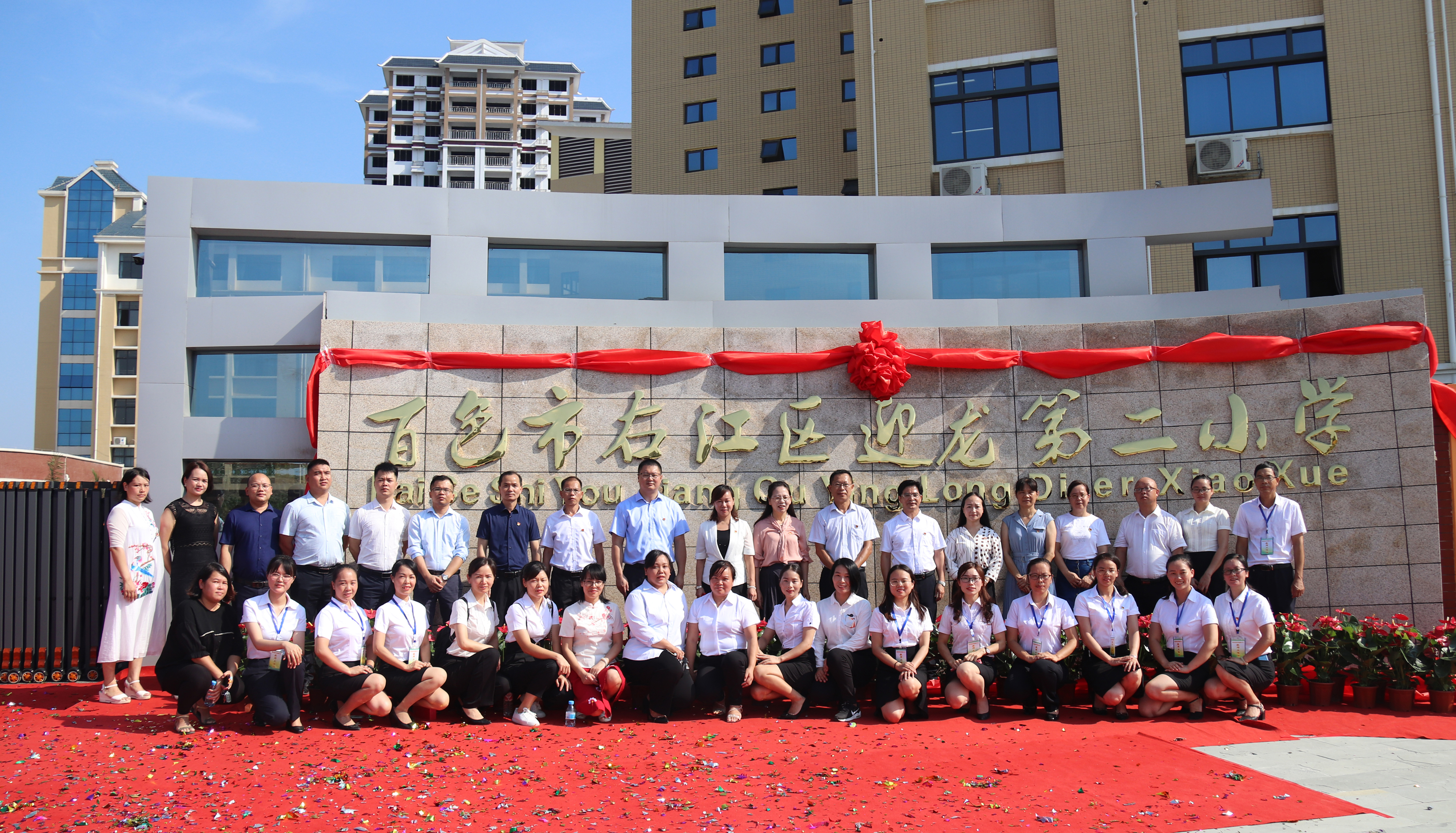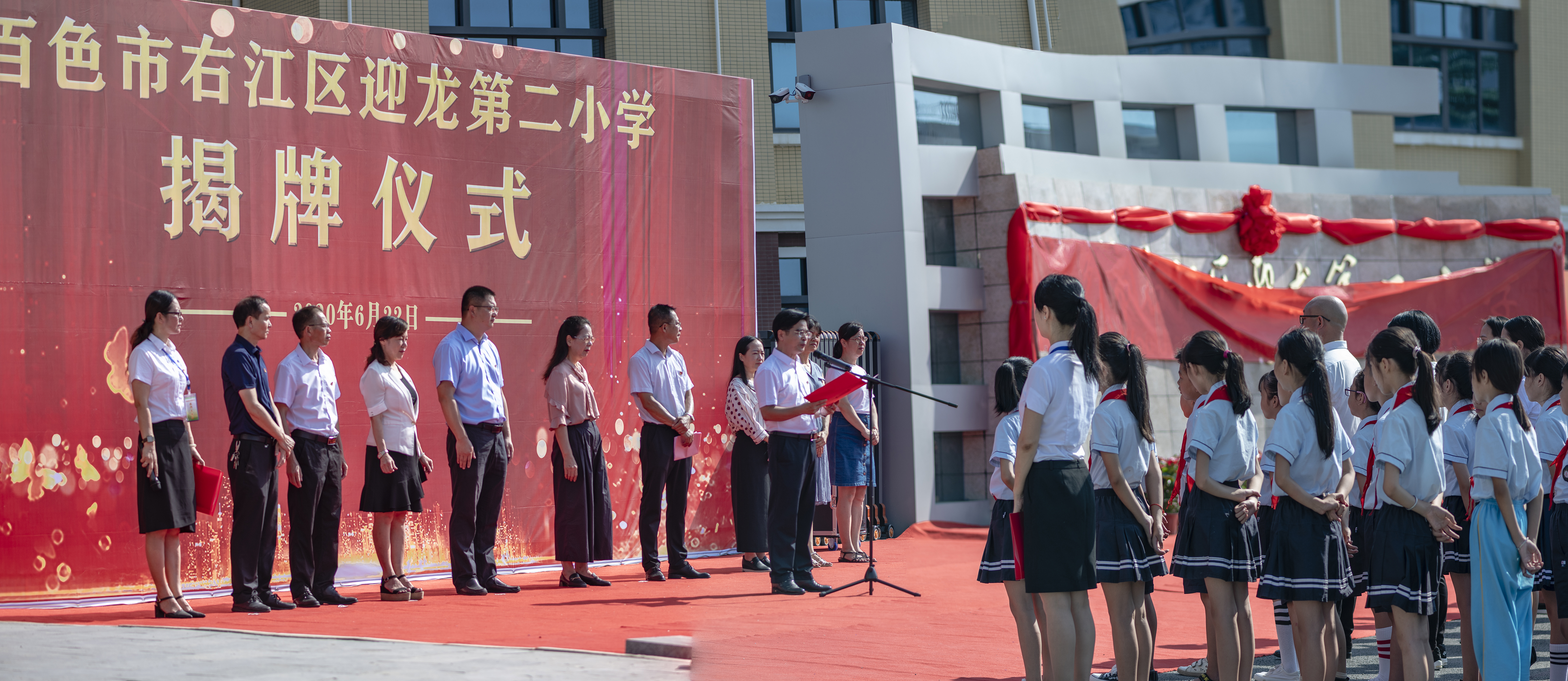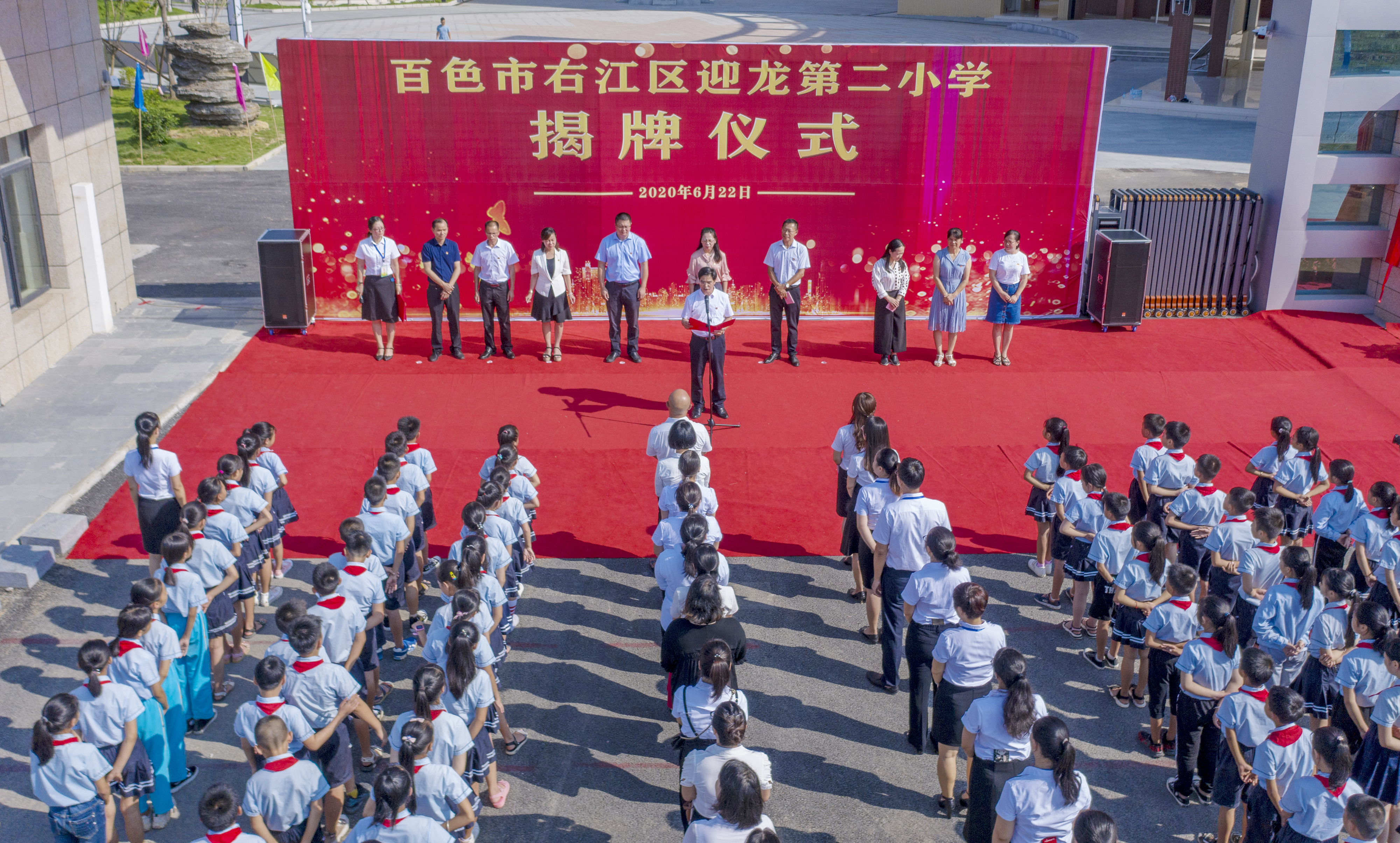 ????6月22日上午,百色市右江區(qū)迎龍第二小學(xué)揭牌儀式在該校大門舉行,標(biāo)志著這所由廣西百色益眾投資有限公司承建的小學(xué)全面交付使用。