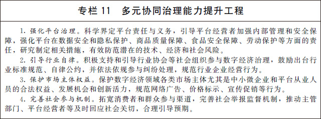 (三)完善多元共治新格局。建立完善政府、平臺、企業(yè)、行業(yè)組織和社會公眾多元參與、有效協(xié)同的數(shù)字經(jīng)濟治理新格局,形成治理合力,鼓勵良性競爭,維護公平有效市場。加快健全市場準(zhǔn)入制度、公平競爭審查機制,完善數(shù)字經(jīng)濟公平競爭監(jiān)管制度,預(yù)防和制止濫用行政權(quán)力排除限制競爭。進一步明確平臺企業(yè)主體責(zé)任和義務(wù),推進行業(yè)服務(wù)標(biāo)準(zhǔn)建設(shè)和行業(yè)自律,保護平臺從業(yè)人員和消費者合法權(quán)益。開展社會監(jiān)督、媒體監(jiān)督、公眾監(jiān)督,培育多元治理、協(xié)調(diào)發(fā)展新生態(tài)。鼓勵建立爭議在線解決機制和渠道,制定并公示爭議解決規(guī)則。引導(dǎo)社會各界積極參與推動數(shù)字經(jīng)濟治理,加強和改進反壟斷執(zhí)法,暢通多元主體訴求表達、權(quán)益保障渠道,及時化解矛盾糾紛,維護公眾利益和社會穩(wěn)定。