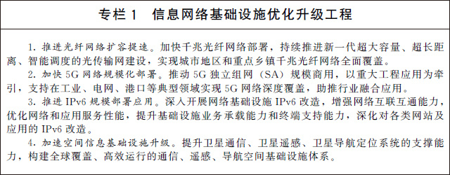 (一)加快建設(shè)信息網(wǎng)絡(luò)基礎(chǔ)設(shè)施。建設(shè)高速泛在、天地一體、云網(wǎng)融合、智能敏捷、綠色低碳、安全可控的智能化綜合性數(shù)字信息基礎(chǔ)設(shè)施。有序推進骨干網(wǎng)擴容,協(xié)同推進千兆光纖網(wǎng)絡(luò)和5G網(wǎng)絡(luò)基礎(chǔ)設(shè)施建設(shè),推動5G商用部署和規(guī)模應(yīng)用,前瞻布局第六代移動通信(6G)網(wǎng)絡(luò)技術(shù)儲備,加大6G技術(shù)研發(fā)支持力度,積極參與推動6G國際標(biāo)準(zhǔn)化工作。積極穩(wěn)妥推進空間信息基礎(chǔ)設(shè)施演進升級,加快布局衛(wèi)星通信網(wǎng)絡(luò)等,推動衛(wèi)星互聯(lián)網(wǎng)建設(shè)。提高物聯(lián)網(wǎng)在工業(yè)制造、農(nóng)業(yè)生產(chǎn)、公共服務(wù)、應(yīng)急管理等領(lǐng)域的覆蓋水平,增強固移融合、寬窄結(jié)合的物聯(lián)接入能力。
