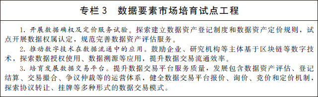 (二)加快數(shù)據(jù)要素市場化流通。加快構(gòu)建數(shù)據(jù)要素市場規(guī)則,培育市場主體、完善治理體系,促進數(shù)據(jù)要素市場流通。鼓勵市場主體探索數(shù)據(jù)資產(chǎn)定價機制,推動形成數(shù)據(jù)資產(chǎn)目錄,逐步完善數(shù)據(jù)定價體系。規(guī)范數(shù)據(jù)交易管理,培育規(guī)范的數(shù)據(jù)交易平臺和市場主體,建立健全數(shù)據(jù)資產(chǎn)評估、登記結(jié)算、交易撮合、爭議仲裁等市場運營體系,提升數(shù)據(jù)交易效率。嚴(yán)厲打擊數(shù)據(jù)黑市交易,營造安全有序的市場環(huán)境。