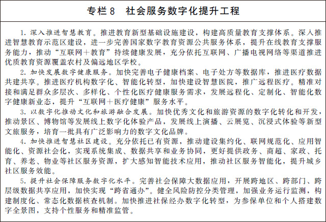 (二)提升社會服務(wù)數(shù)字化普惠水平。加快推動文化教育、醫(yī)療健康、會展旅游、體育健身等領(lǐng)域公共服務(wù)資源數(shù)字化供給和網(wǎng)絡(luò)化服務(wù),促進優(yōu)質(zhì)資源共享復(fù)用。充分運用新型數(shù)字技術(shù),強化就業(yè)、養(yǎng)老、兒童福利、托育、家政等民生領(lǐng)域供需對接,進一步優(yōu)化資源配置。發(fā)展智慧廣電網(wǎng)絡(luò),加快推進全國有線電視網(wǎng)絡(luò)整合和升級改造。深入開展電信普遍服務(wù)試點,提升農(nóng)村及偏遠地區(qū)網(wǎng)絡(luò)覆蓋水平。加強面向革命老區(qū)、民族地區(qū)、邊疆地區(qū)、脫貧地區(qū)的遠程服務(wù),拓展教育、醫(yī)療、社保、對口幫扶等服務(wù)內(nèi)容,助力基本公共服務(wù)均等化。加強信息無障礙建設(shè),提升面向特殊群體的數(shù)字化社會服務(wù)能力。促進社會服務(wù)和數(shù)字平臺深度融合,探索多領(lǐng)域跨界合作,推動醫(yī)養(yǎng)結(jié)合、文教結(jié)合、體醫(yī)結(jié)合、文旅融合。