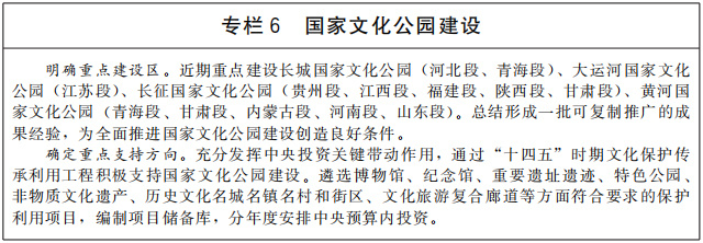 推進(jìn)國(guó)家文化公園建設(shè),生動(dòng)呈現(xiàn)中華文化的獨(dú)特創(chuàng)造、價(jià)值理念和鮮明特色,樹(shù)立和突出各民族共享的中華文化符號(hào)和中華民族形象,探索新時(shí)代文物和文化資源保護(hù)傳承利用新路徑,把國(guó)家文化公園建設(shè)成為傳承中華文明的歷史文化走廊、中華民族共同精神家園、提升人民生活品質(zhì)的文化和旅游體驗(yàn)空間。加快建設(shè)長(zhǎng)城、大運(yùn)河、長(zhǎng)征、黃河等國(guó)家文化公園,整合具有突出意義、重要影響、重大主題的文物和文化資源,重點(diǎn)建設(shè)管控保護(hù)、主題展示、文旅融合、傳統(tǒng)利用四類主體功能區(qū),實(shí)施保護(hù)傳承、研究發(fā)掘、環(huán)境配套、文旅融合、數(shù)字再現(xiàn)五大工程,突出“萬(wàn)里長(zhǎng)城”“千年運(yùn)河”“兩萬(wàn)五千里長(zhǎng)征”“九曲黃河”整體辨識(shí)度。推進(jìn)優(yōu)質(zhì)文化旅游資源一體化開(kāi)發(fā),科學(xué)規(guī)劃、開(kāi)發(fā)文化旅游產(chǎn)品和商品。推出參觀游覽聯(lián)程聯(lián)運(yùn)經(jīng)典線路,開(kāi)展整體品牌塑造和營(yíng)銷推介。