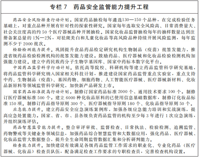 完善藥品安全監(jiān)管制度。加強(qiáng)藥物臨床試驗(yàn)核查,嚴(yán)格執(zhí)行藥品、醫(yī)療器械、化妝品等生產(chǎn)質(zhì)量管理規(guī)范,對(duì)重點(diǎn)生產(chǎn)企業(yè)開(kāi)展全覆蓋檢查。開(kāi)展藥品質(zhì)量提升行動(dòng),健全生物制品等高風(fēng)險(xiǎn)產(chǎn)品標(biāo)準(zhǔn)制定工作機(jī)制,提高藥品、醫(yī)療器械、化妝品標(biāo)準(zhǔn)。改革和完善疫苗監(jiān)管體制機(jī)制,提高省級(jí)藥品檢驗(yàn)檢測(cè)機(jī)構(gòu)對(duì)轄區(qū)內(nèi)生產(chǎn)的主要疫苗品種批簽發(fā)能力。深入開(kāi)展無(wú)菌植入性醫(yī)療器械監(jiān)督檢查、化妝品“線上凈網(wǎng)、線下清源”等專項(xiàng)整治行動(dòng),切實(shí)規(guī)范藥品、醫(yī)療器械、化妝品市場(chǎng)秩序。