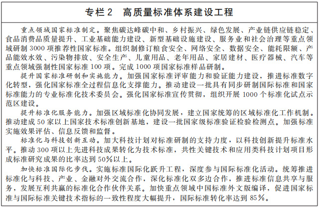深化標(biāo)準(zhǔn)化改革創(chuàng)新。加快標(biāo)準(zhǔn)供給由政府主導(dǎo)向政府與市場(chǎng)并重轉(zhuǎn)變,標(biāo)準(zhǔn)運(yùn)用由產(chǎn)業(yè)與貿(mào)易為主向經(jīng)濟(jì)社會(huì)全域轉(zhuǎn)變,標(biāo)準(zhǔn)化工作由國(guó)內(nèi)驅(qū)動(dòng)向國(guó)內(nèi)國(guó)際相互促進(jìn)轉(zhuǎn)變,標(biāo)準(zhǔn)化發(fā)展由數(shù)量規(guī)模型向質(zhì)量效益型轉(zhuǎn)變。持續(xù)優(yōu)化政府頒布標(biāo)準(zhǔn)與市場(chǎng)自主制定標(biāo)準(zhǔn)協(xié)調(diào)配合的新型標(biāo)準(zhǔn)體系,推動(dòng)一般性產(chǎn)品、服務(wù)標(biāo)準(zhǔn)由市場(chǎng)自主制定,建立健全政府頒布標(biāo)準(zhǔn)采信市場(chǎng)自主制定標(biāo)準(zhǔn)的機(jī)制。建立法規(guī)引用標(biāo)準(zhǔn)制度,強(qiáng)化法規(guī)與標(biāo)準(zhǔn)有效協(xié)調(diào)機(jī)制,運(yùn)用標(biāo)準(zhǔn)支撐法規(guī)落地實(shí)施。加強(qiáng)標(biāo)準(zhǔn)化技術(shù)組織建設(shè),提升國(guó)家標(biāo)準(zhǔn)研制和實(shí)施能力。加強(qiáng)國(guó)家技術(shù)標(biāo)準(zhǔn)創(chuàng)新基地和國(guó)家級(jí)標(biāo)準(zhǔn)驗(yàn)證檢驗(yàn)檢測(cè)點(diǎn)建設(shè),提升標(biāo)準(zhǔn)化技術(shù)支撐水平。實(shí)施標(biāo)準(zhǔn)全生命周期閉環(huán)管理,完善標(biāo)準(zhǔn)實(shí)施信息反饋與評(píng)估制度,建立國(guó)家標(biāo)準(zhǔn)動(dòng)態(tài)維護(hù)機(jī)制。開(kāi)展對(duì)標(biāo)達(dá)標(biāo)專項(xiàng)行動(dòng),推動(dòng)團(tuán)體標(biāo)準(zhǔn)培優(yōu)計(jì)劃和企業(yè)標(biāo)準(zhǔn)領(lǐng)跑者制度實(shí)施,消除標(biāo)準(zhǔn)制定團(tuán)體培育發(fā)展的政策障礙,釋放企業(yè)、社會(huì)團(tuán)體標(biāo)準(zhǔn)化活力。
