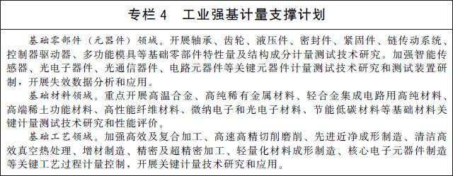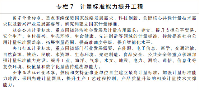 (十九)推進計量標準建設。改革計量標準體系架構,統(tǒng)籌考慮技術能力和現(xiàn)實需求,建立國家計量標準、社會公用計量標準、部門行業(yè)計量標準、企事業(yè)單位計量標準為主體的層次分明、鏈條清晰的計量標準基礎設施網(wǎng)絡。實施計量標準能力提升工程,在重點領域新建一批國家計量標準,加快推進各級各類計量標準技術改造和升級換代。建立嵌入式、芯片級、小型化的計量標準,推動對制造過程的實時在線測量和最佳控制。
