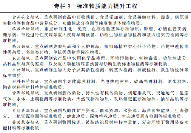 (二十)加大標準物質研制應用。建立完善以國家基準物質、國家標準物質和工作標準物質為主要組成部分的標準物質體系。實施標準物質能力提升工程,加快生命科學、生物醫(yī)藥、環(huán)境監(jiān)測、食品安全、自然資源、刑事司法等重點領域的標準物質研制和應用。加強標準物質監(jiān)管能力建設和關鍵共性技術研究,提升標準物質不確定度水平。探索建立標準物質質量追溯制度,建設一批標準物質量值核查驗證實驗室,建立標準物質質量追溯平臺,形成研發(fā)、生產、應用全壽命周期的監(jiān)管能力。