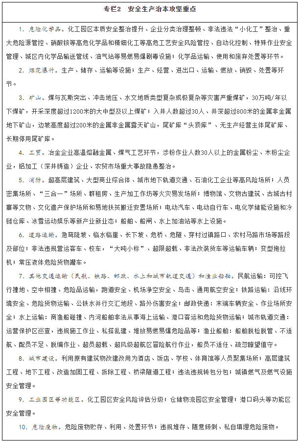 深化專項(xiàng)整治。深入推進(jìn)危險(xiǎn)化學(xué)品、礦山、消防、交通運(yùn)輸、建筑施工、民爆、特種設(shè)備、大型商業(yè)綜合體等重點(diǎn)行業(yè)領(lǐng)域安全整治,解決影響制約安全生產(chǎn)的薄弱環(huán)節(jié)和突出問(wèn)題,督促企業(yè)嚴(yán)格安全管理、加大安全投入、落實(shí)風(fēng)險(xiǎn)管控措施。結(jié)合深化供給側(cè)結(jié)構(gòu)性改革,推動(dòng)安全基礎(chǔ)薄弱、安全保障能力低下且整改后仍不達(dá)標(biāo)的企業(yè)退出市場(chǎng)。統(tǒng)籌考慮危險(xiǎn)化學(xué)品企業(yè)搬遷和項(xiàng)目建設(shè)審批,優(yōu)先保障符合條件企業(yè)的搬遷用地。持續(xù)推進(jìn)企業(yè)安全生產(chǎn)標(biāo)準(zhǔn)化建設(shè),實(shí)現(xiàn)安全管理、操作行為、設(shè)施設(shè)備和作業(yè)環(huán)境規(guī)范化。推動(dòng)淘汰落后技術(shù)、工藝、材料和設(shè)備,加大重點(diǎn)設(shè)施設(shè)備、儀器儀表檢驗(yàn)檢測(cè)力度。推動(dòng)各類金融機(jī)構(gòu)出臺(tái)優(yōu)惠貸款等金融類產(chǎn)品,大力推廣新技術(shù)、新工藝、新材料和新裝備,實(shí)施智能化礦山、智能化工廠、數(shù)字化車(chē)間改造,開(kāi)展智能化作業(yè)和危險(xiǎn)崗位機(jī)器人替代示范。強(qiáng)化危險(xiǎn)廢物全過(guò)程監(jiān)管,動(dòng)態(tài)修訂《國(guó)家危險(xiǎn)廢物名錄》,修訂危險(xiǎn)廢物鑒別、貯存以及水泥窯協(xié)同處置污染控制等標(biāo)準(zhǔn),制定完善危險(xiǎn)廢物重點(diǎn)監(jiān)管單位清單。建立廢棄危險(xiǎn)化學(xué)品等危險(xiǎn)廢物監(jiān)管協(xié)作和聯(lián)合執(zhí)法工作機(jī)制,加強(qiáng)危險(xiǎn)廢物監(jiān)管能力與應(yīng)急處置技術(shù)支持能力建設(shè)。
